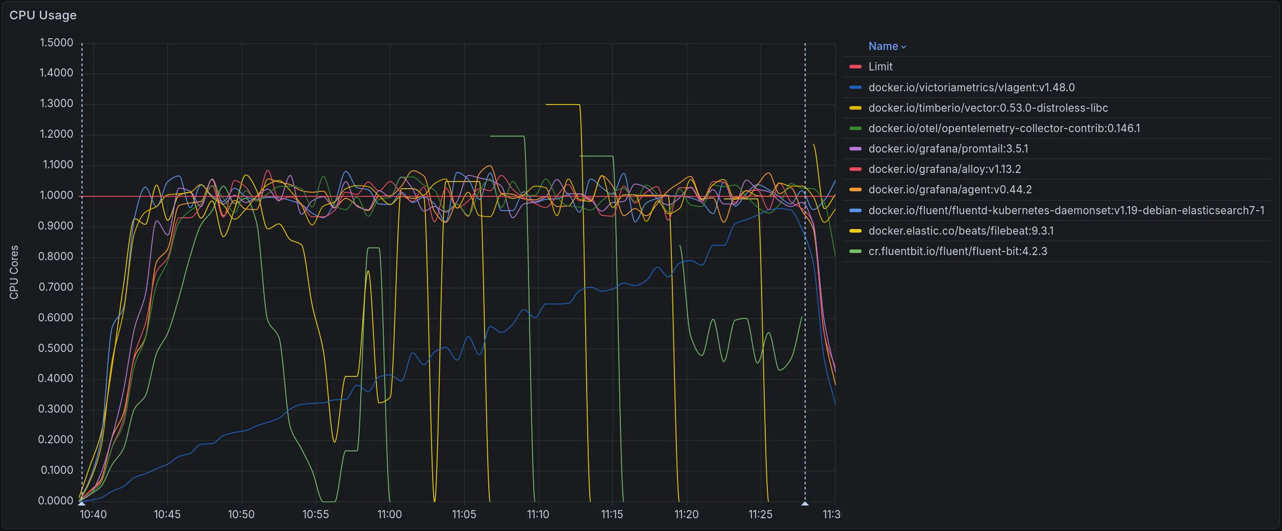 CPU usage across all collectors. The red line marks the 1-core limit
