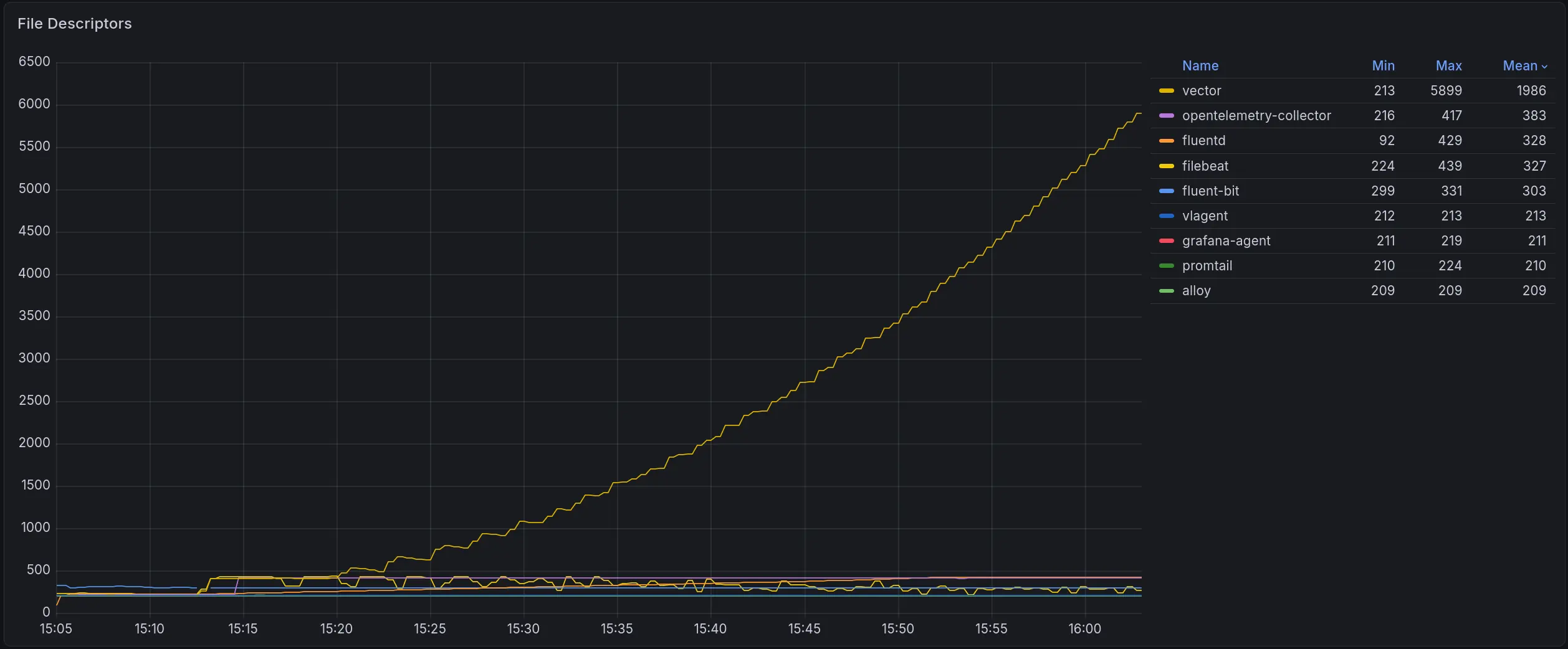 The graph below shows memory usage across the full test duration as load increased from zero to each collector’s ceiling: