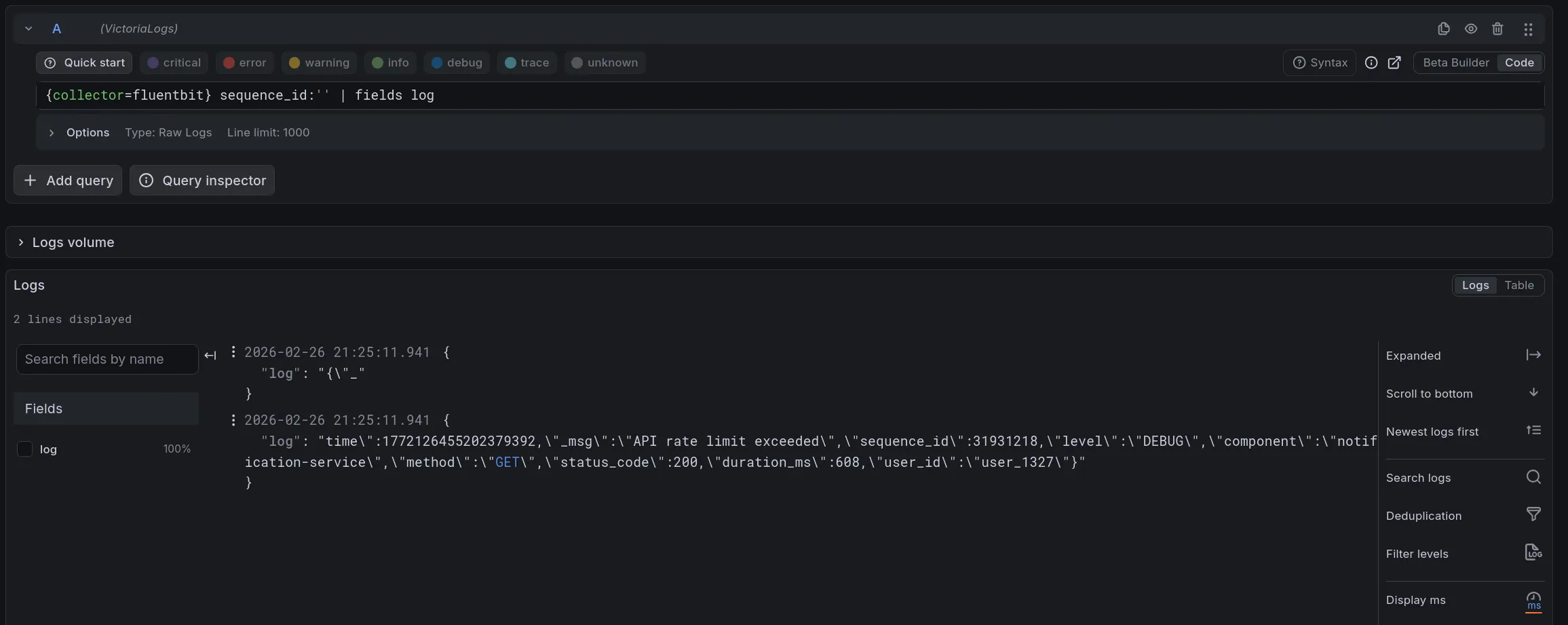 {"_time":"...","_msg":"API rate limit exceeded","sequence_id":50,"level":"DEBUG","status_code":404}