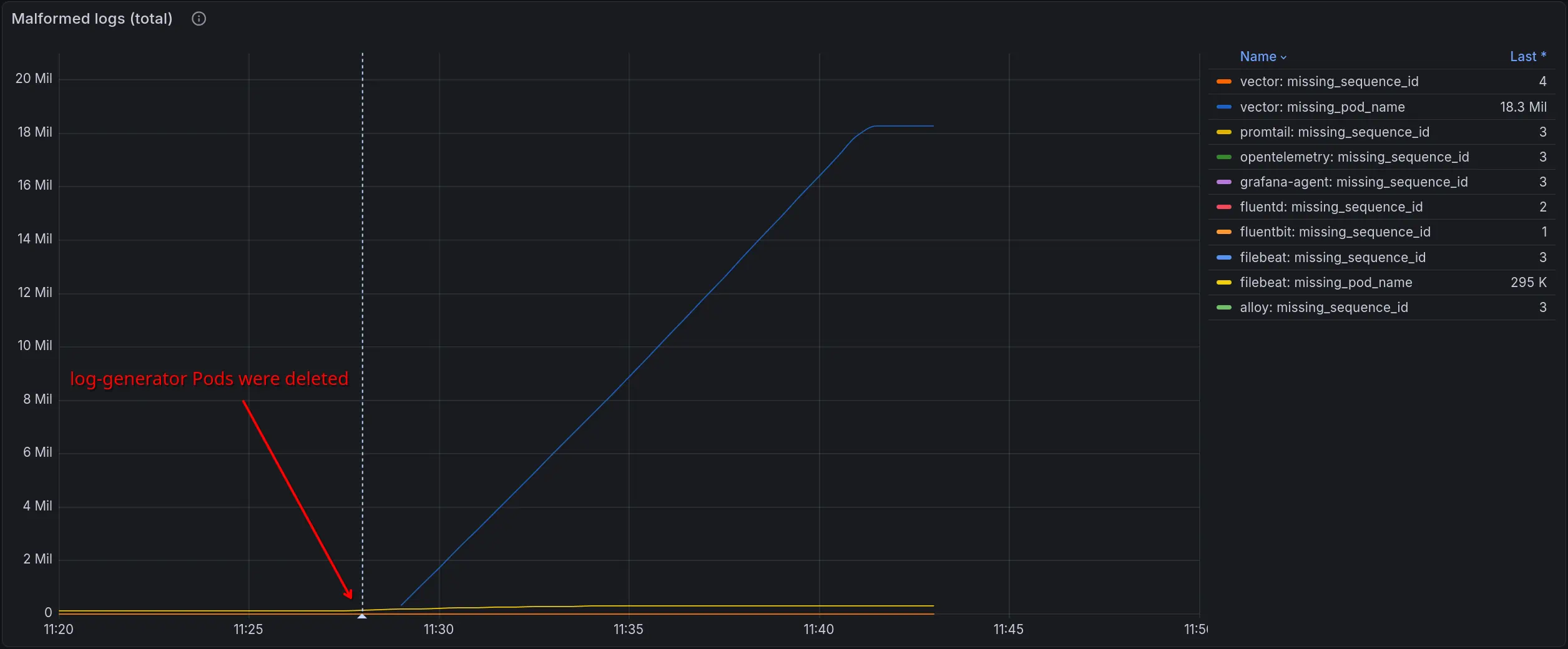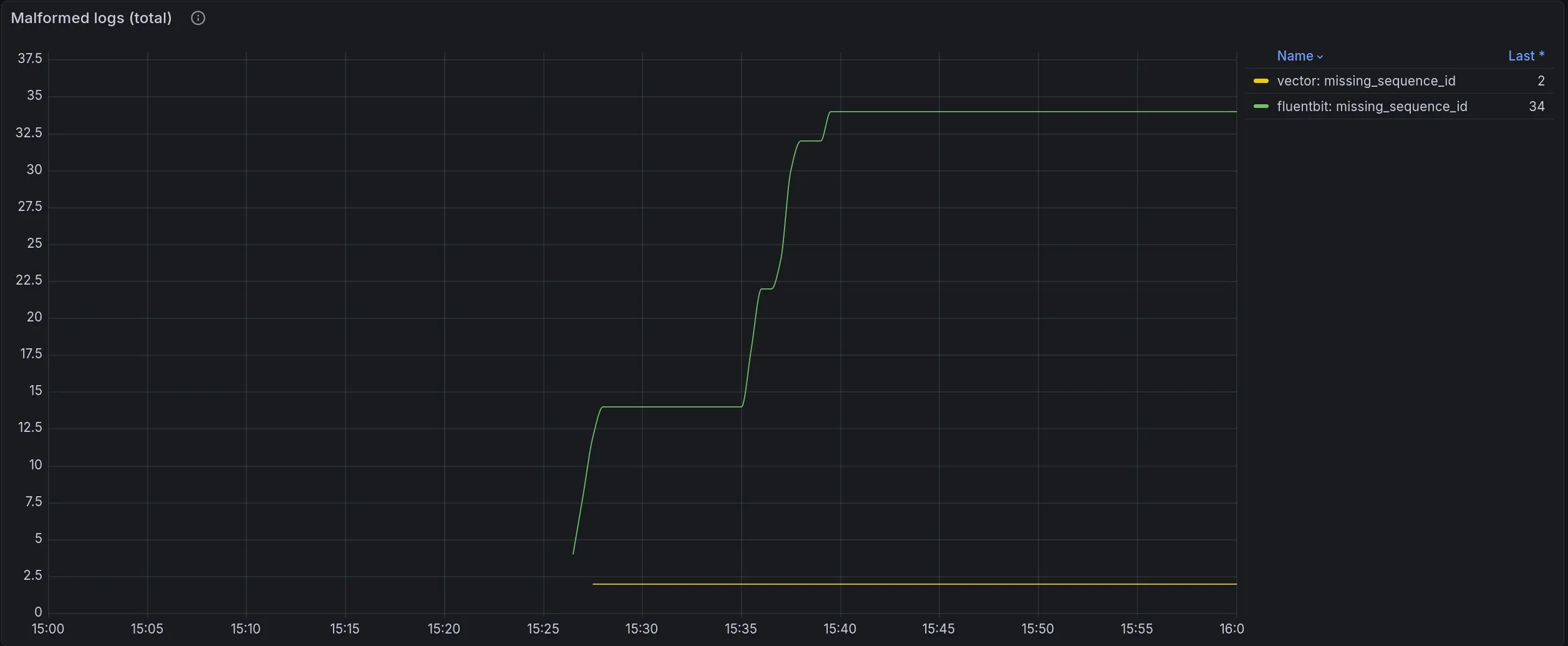 Malformed logs total: Fluent Bit produced 34 records with missing sequence_id, Vector produced 2