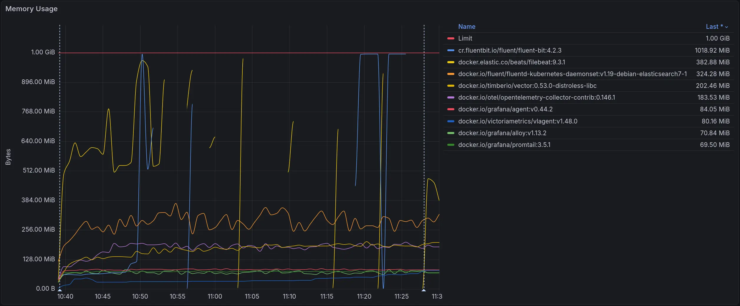Fluent Bit’s and Filebeat’s peak memory exceeds the 1 GiB container limit under the load, causing the container to be killed by the OOM killer. This causes gaps in the graph.