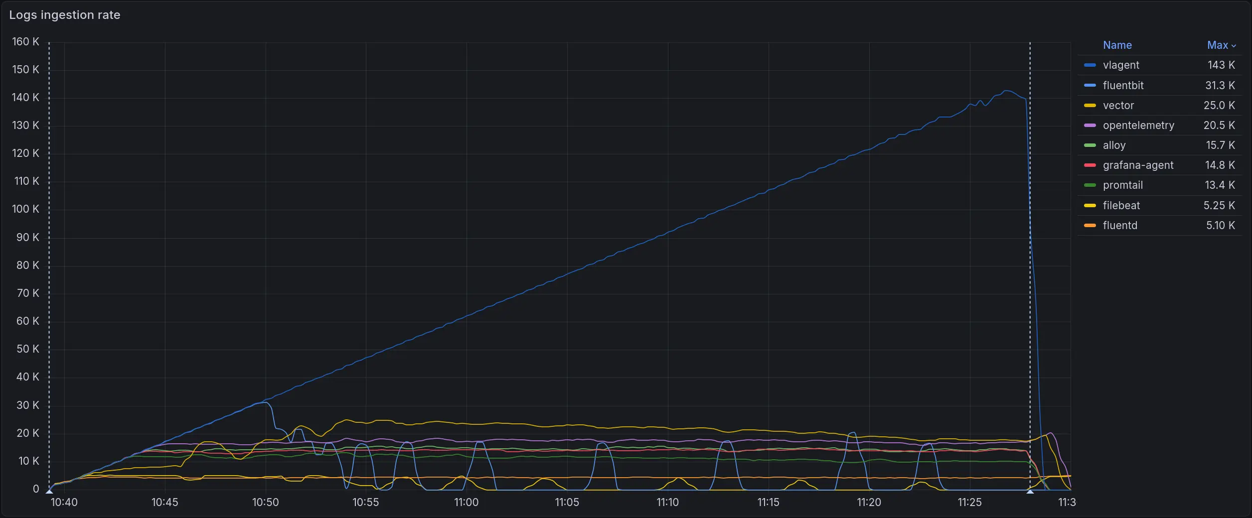 The graph below shows log ingestion rate over time across all collectors running simultaneously, with 100 independent log-generator Pods each writing to its own dedicated log file: