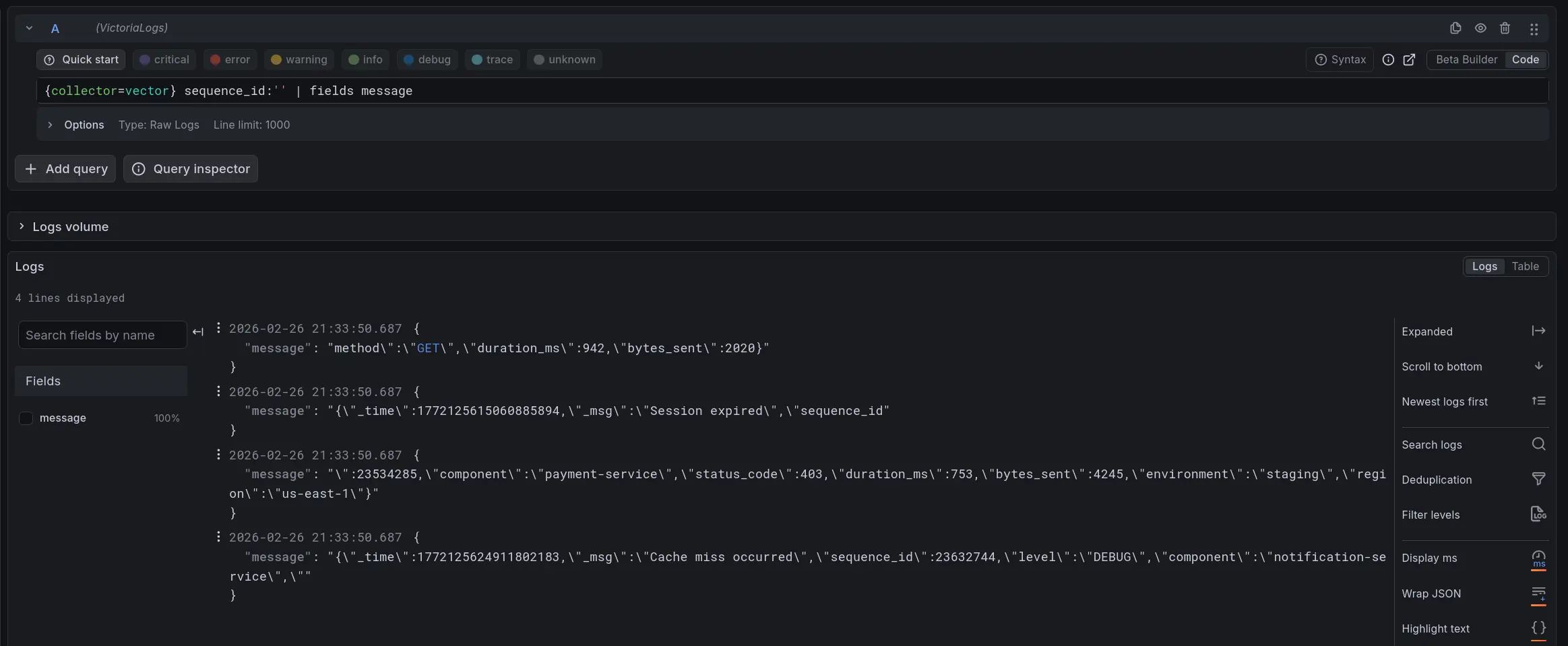 {"_time":"...","_msg":"User authentication completed","sequence_id":53,"component":"payment-service","status_code":201,"duration_ms":322,"user_id":"user_9454"}