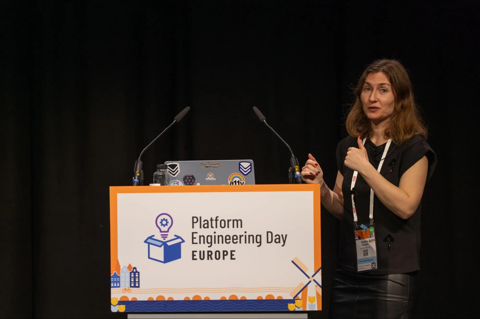 Presented by Diana Todea (VictoriaMetrics) and Elif Samedin, this session opened the conference on Monday morning during Platform Engineering Day. It focused on how different roles within an organization shape platform design decisions, and how those perspectives can sometimes conflict.